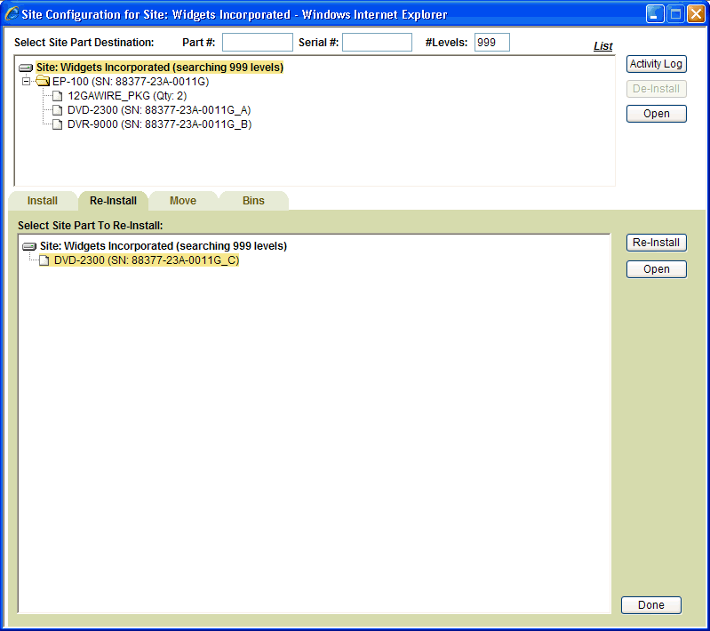 Use the Re-Install tab to re-install previously de-installed site parts. The parts are re-installed back to a location in the site's configuration. The tree view on the tab will show all of the parts for the current site that have been de-installed. If there are no parts to re-install, it will say so in the Select Site Part To Re-Install section.